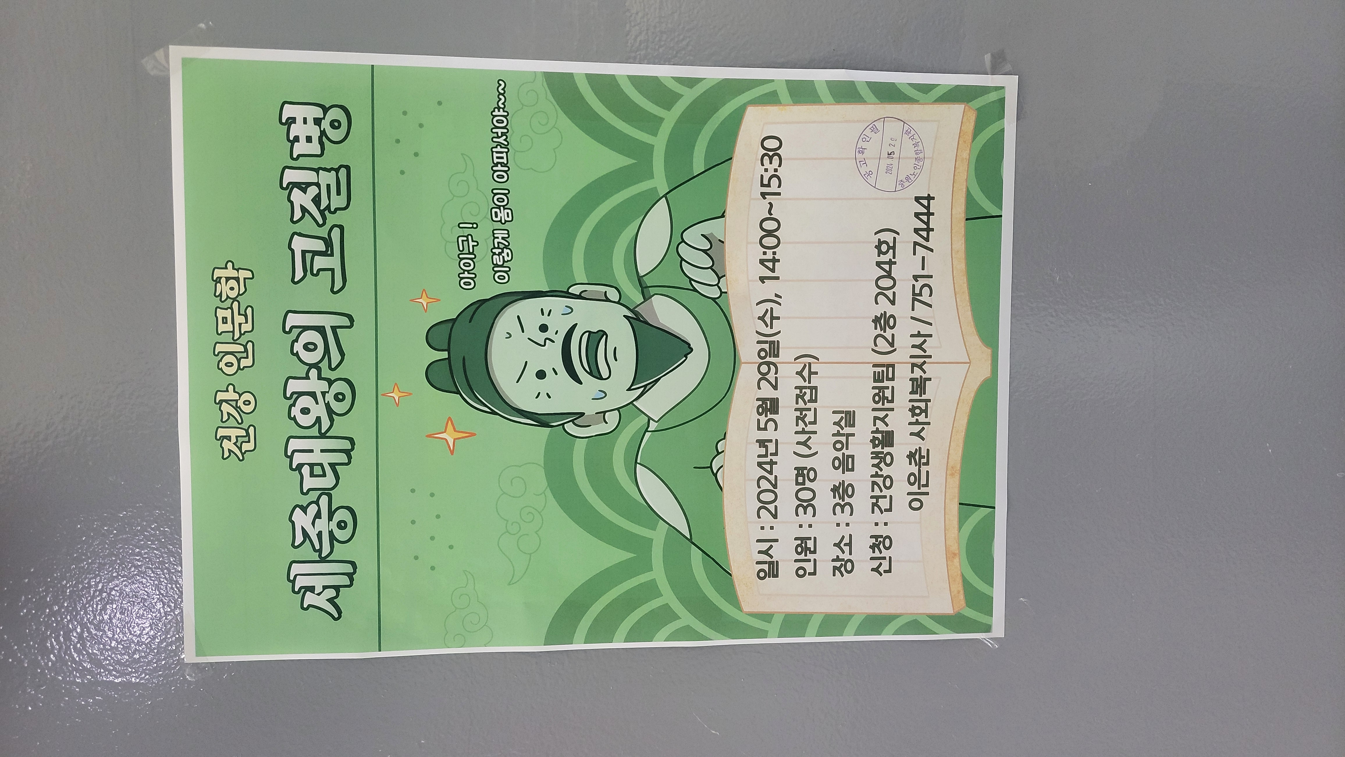 김우현 진료과장님께서 중원노인복지관에서 "세종대왕의 고질병" 이라는 주제로 강의해주셨습니다.