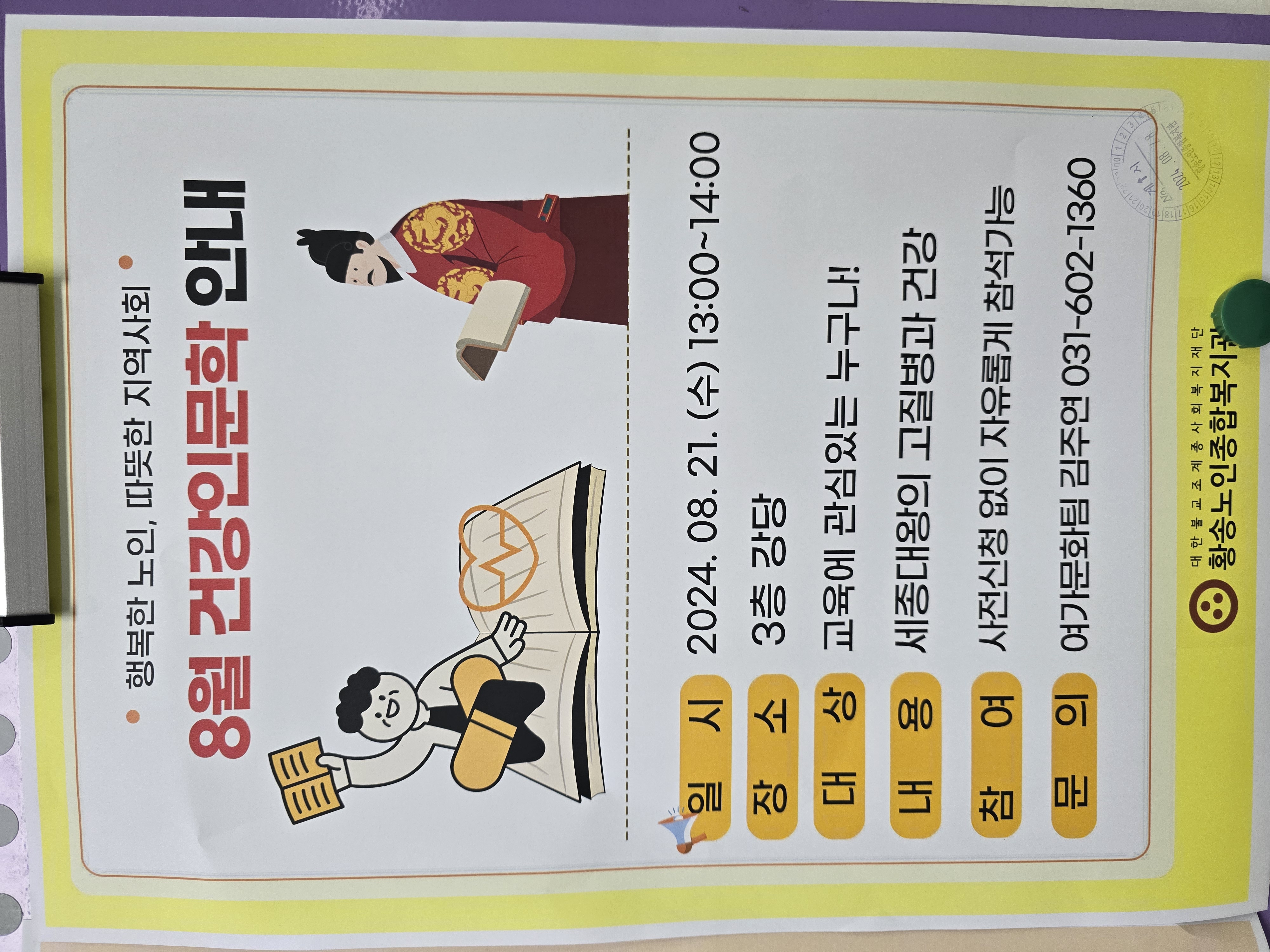 티케이정형외과 김우현 과장님께서 황송노인종합복지관 주민들을 위해 "세종대왕의 고질병과 건강"이라는 주제로 강의를 해주셨습니다.