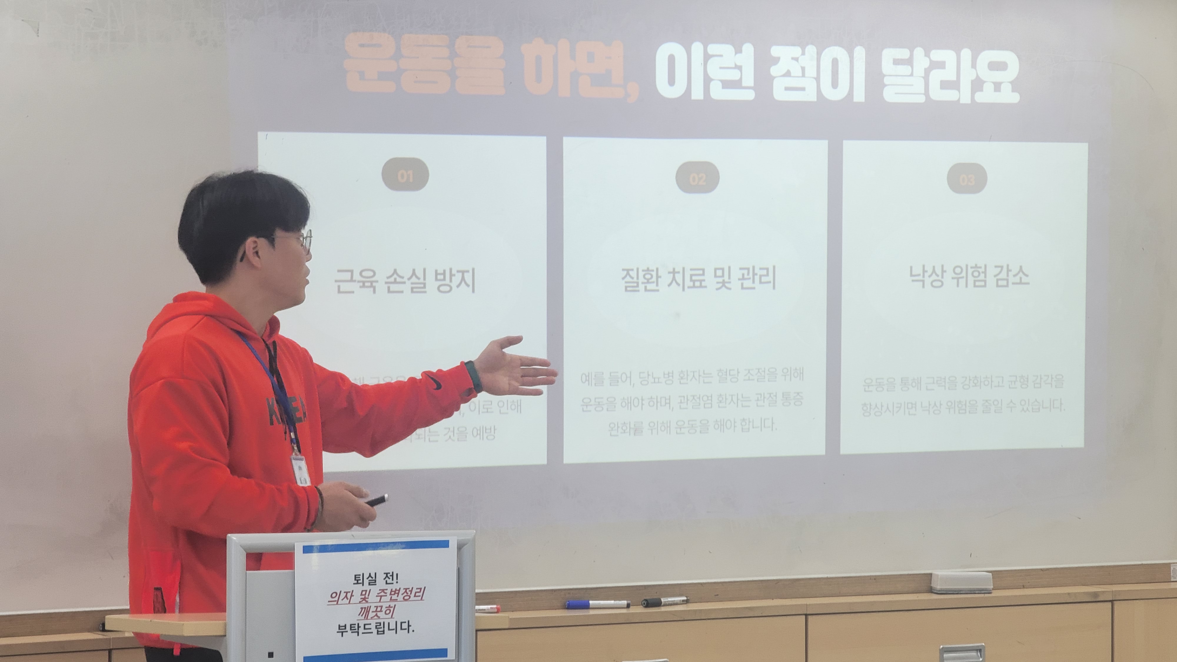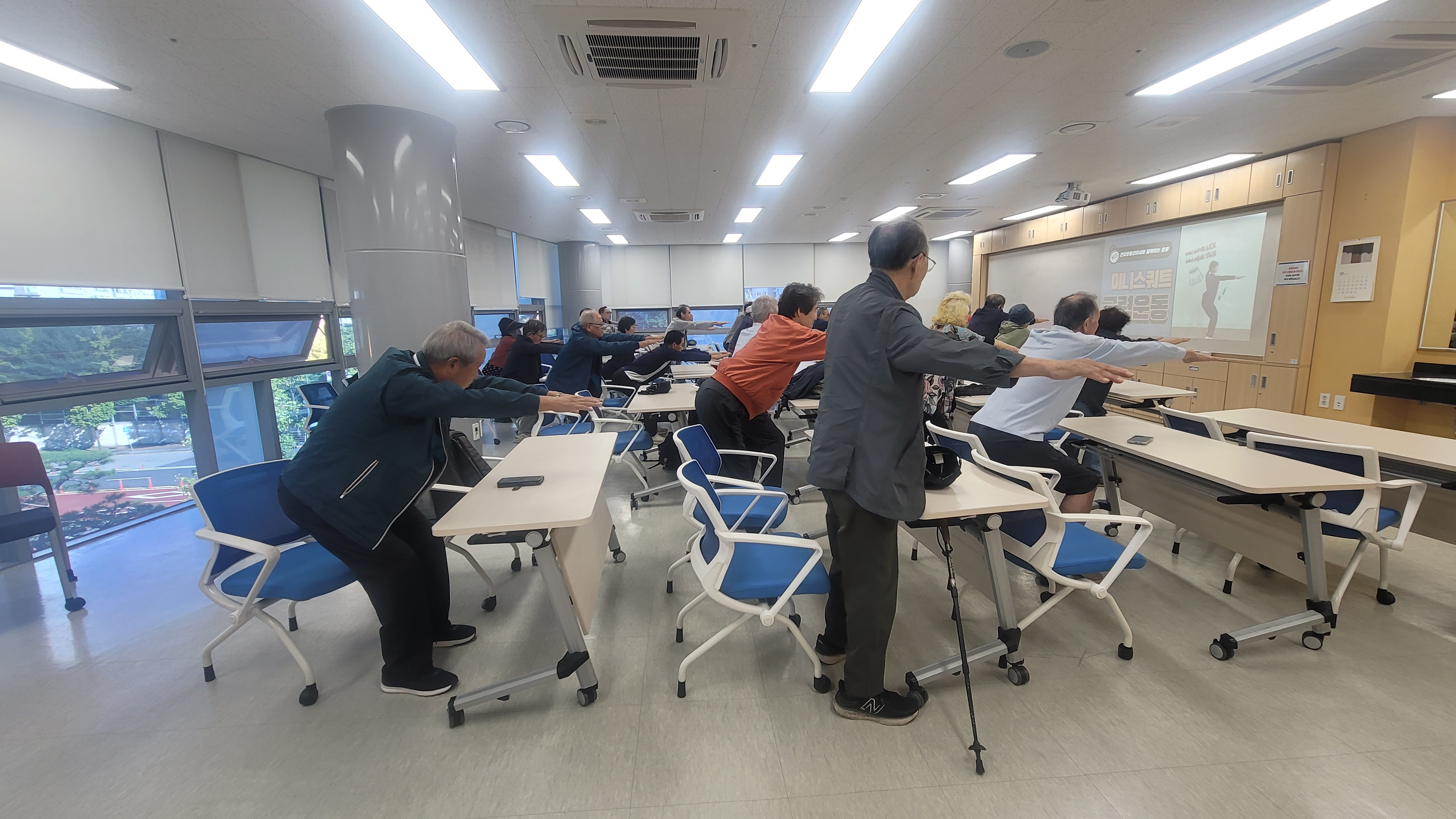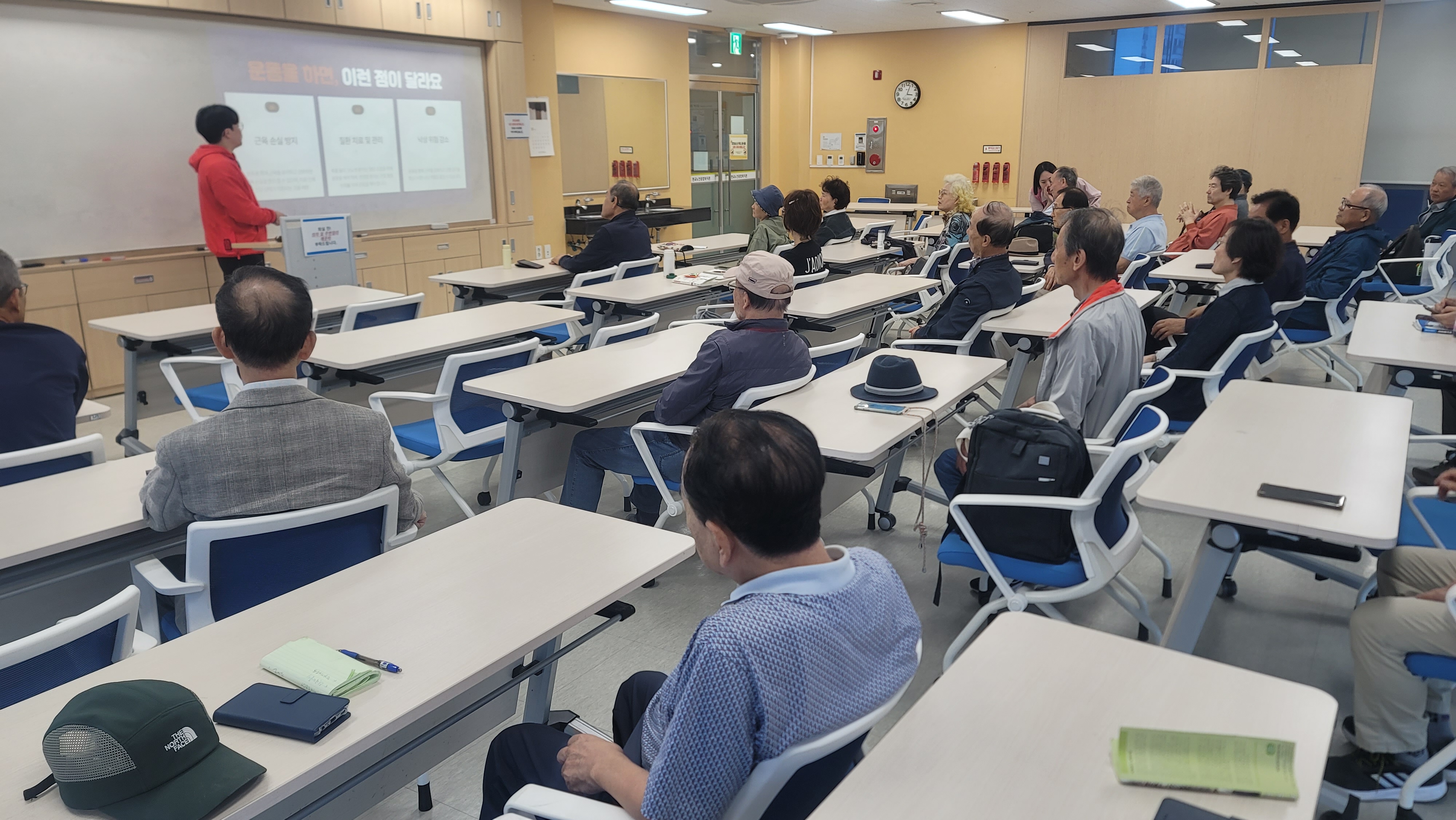 약 30여분의 지역주민들이 참석하였으며 강의 전 일상에서 할 수 있는 5가지 운동을 배웠습니다.